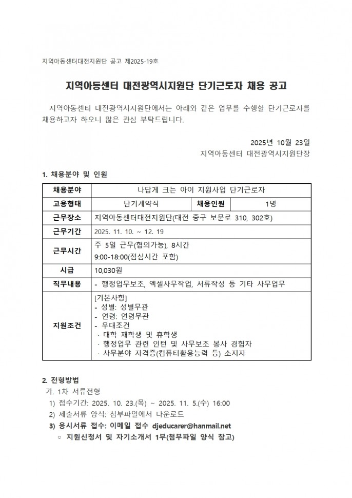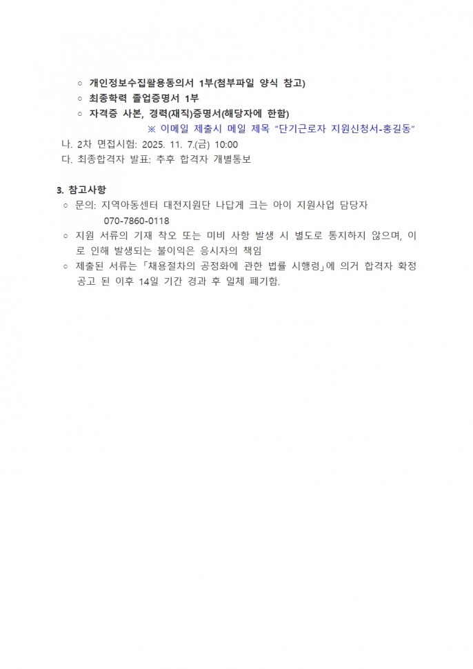 [공지] 나답게 크는 아이 지원사업 단기 근로자…