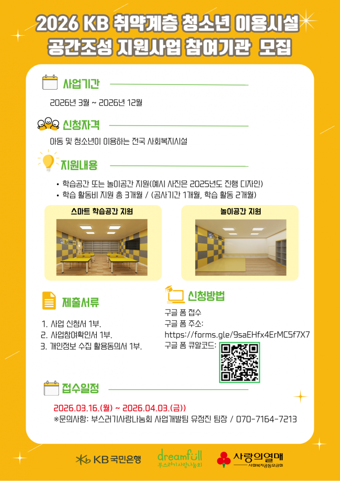 2026 KB Dream Wave 2030 취약계층 청소년 이용시설 공간조성 지원사업을 실시하오니 지역아동센터의 많은 참여 바랍니다.